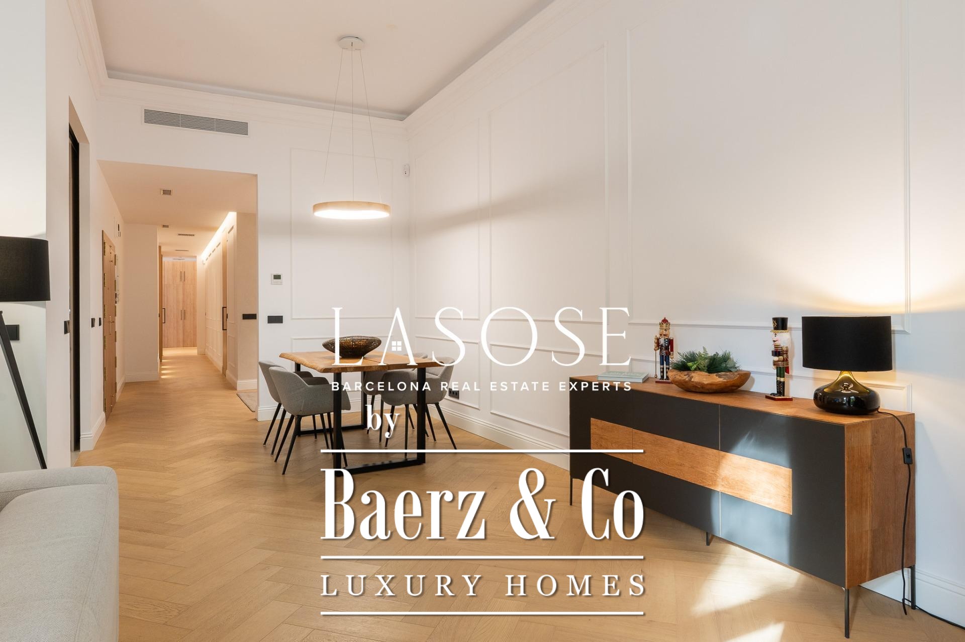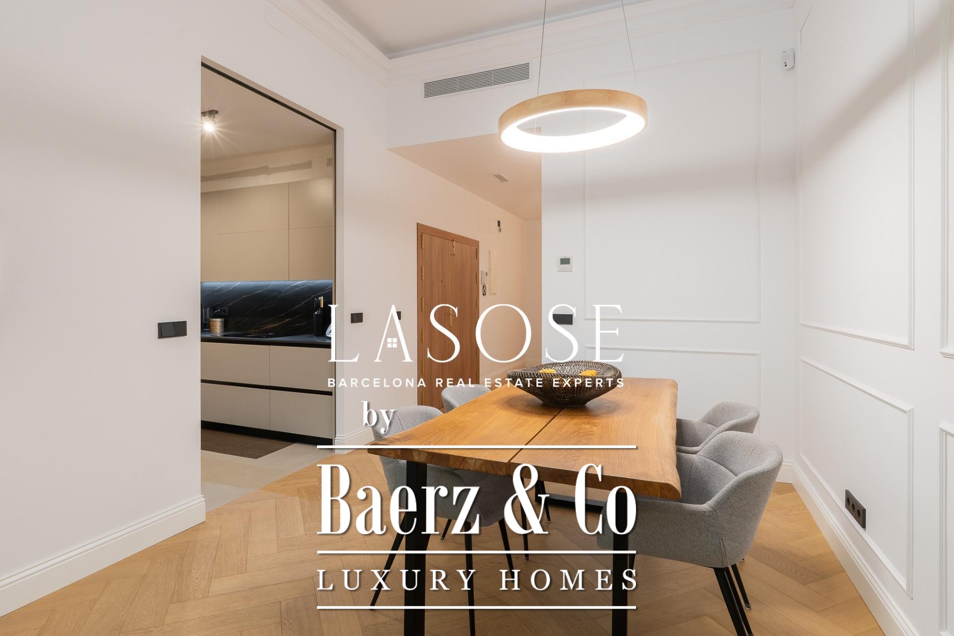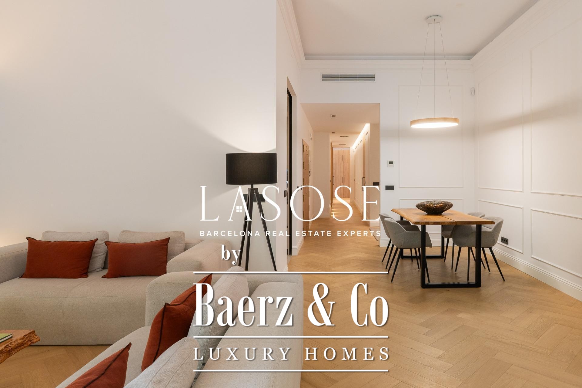 公寓的格局以宽敞的独立客厅与餐厅为核心,配有高挑天花板,三个卧室——包含一间精致套间主卧、一间双人卧室和一间单人卧室——以及两间全卫。厨房全套配置,运用当代设计与优质材质,现代感与传统格调无缝结合。约4.61平方米的阳台带来充足采光、城市景观,并与Carrer de Casp街道的氛围自然联通。