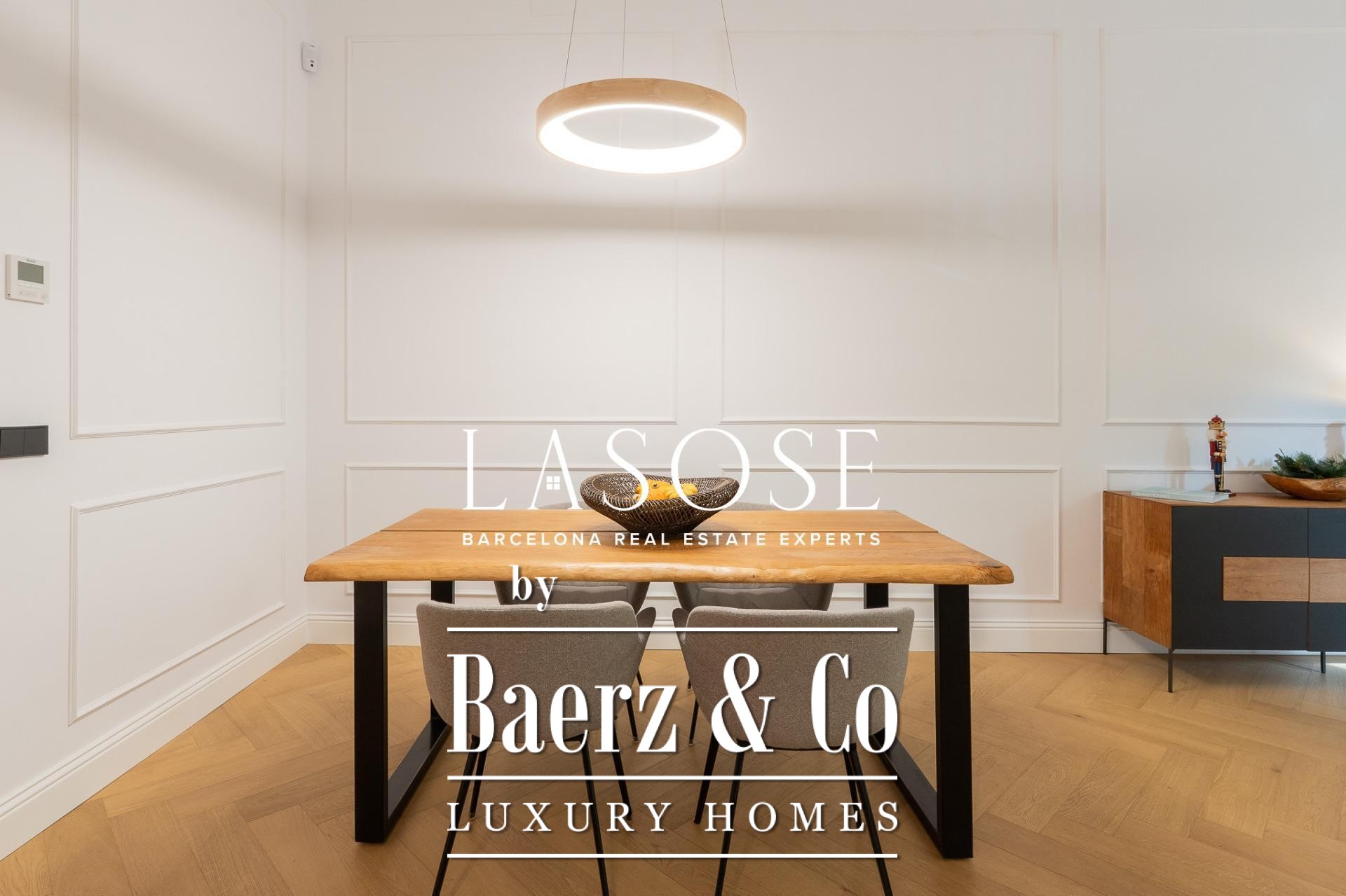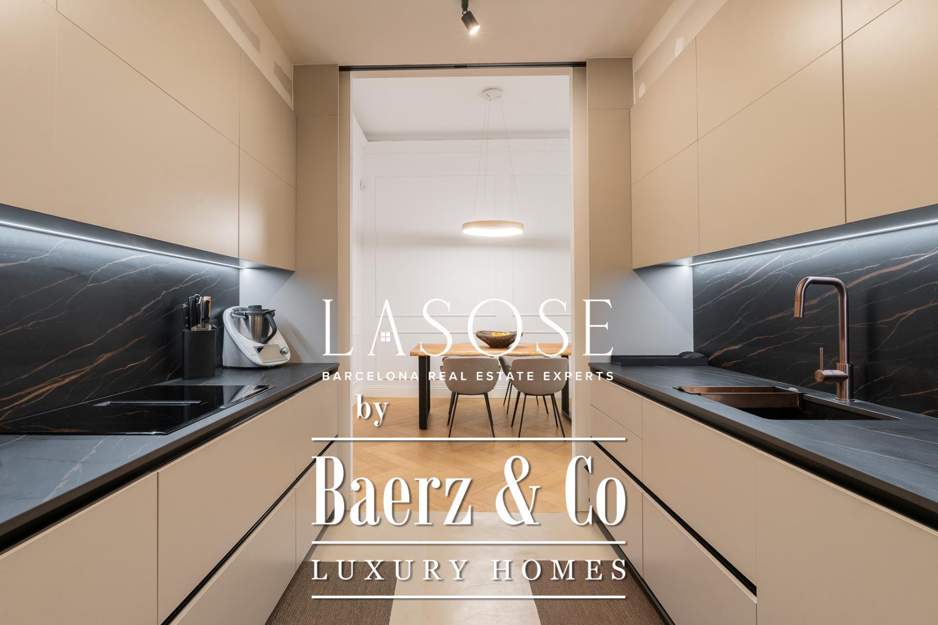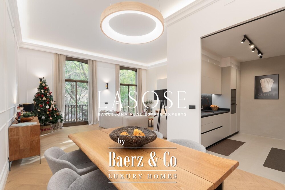 公寓的格局以宽敞的独立客厅与餐厅为核心,配有高挑天花板,三个卧室——包含一间精致套间主卧、一间双人卧室和一间单人卧室——以及两间全卫。厨房全套配置,运用当代设计与优质材质,现代感与传统格调无缝结合。约4.61平方米的阳台带来充足采光、城市景观,并与Carrer de Casp街道的氛围自然联通。