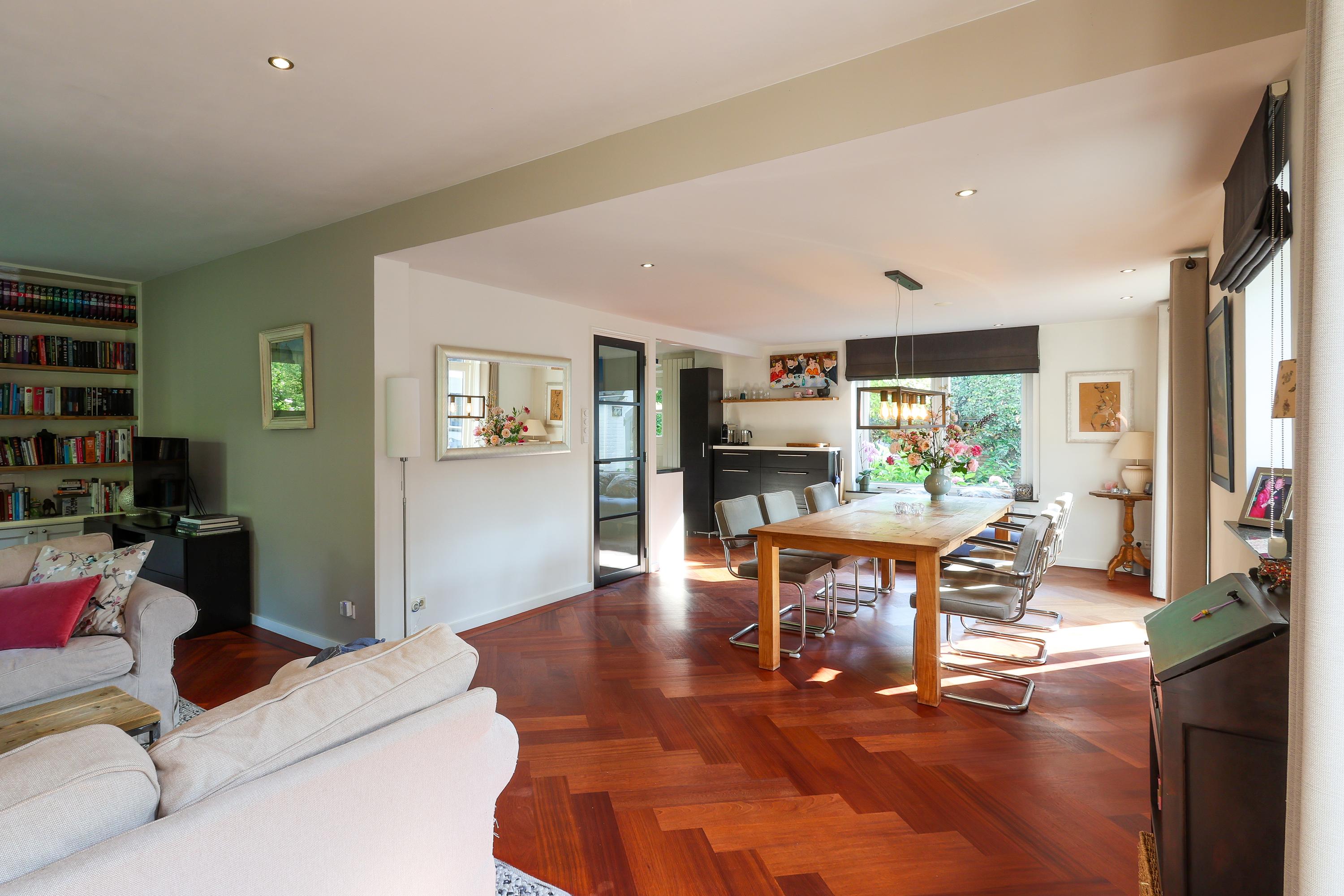 L型客厅铺设了拼花地板并配有燃气壁炉,通过法式落地门直通阳光充沛的花园露台。开放式厨房配备内嵌电器,可无缝连接至花园。一整层高的地下室为日常起居提供了更多实用空间和储藏便利。