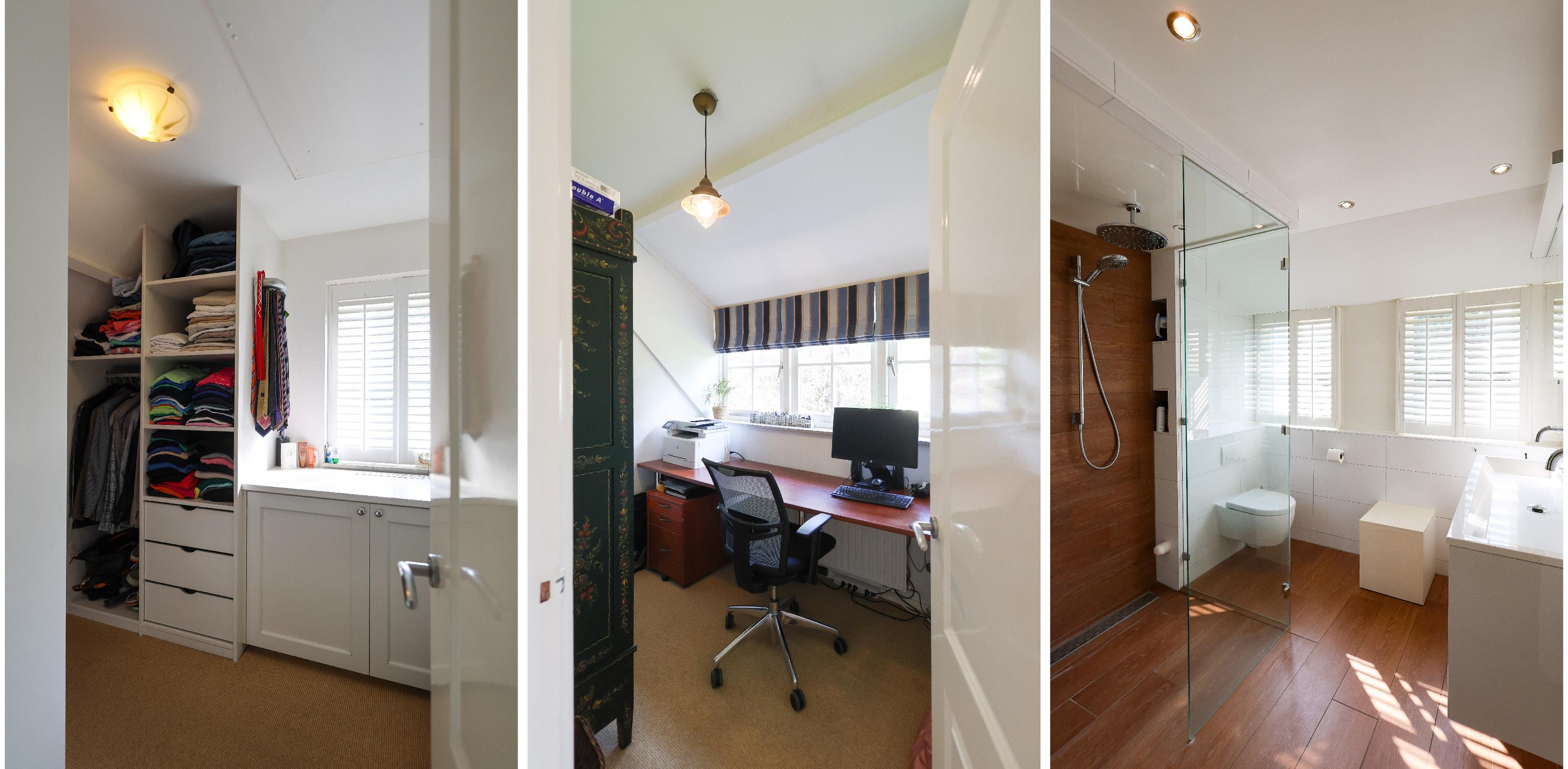 楼上的主人套房设有拱形天花板和阳台,另有两间卧室、一间书房,以及带地暖、步入式淋浴和蒸汽房的现代浴室。前车库已改建为16平方米的独立工作室,提供带有暖气、充足采光的工作空间,并配备水电。