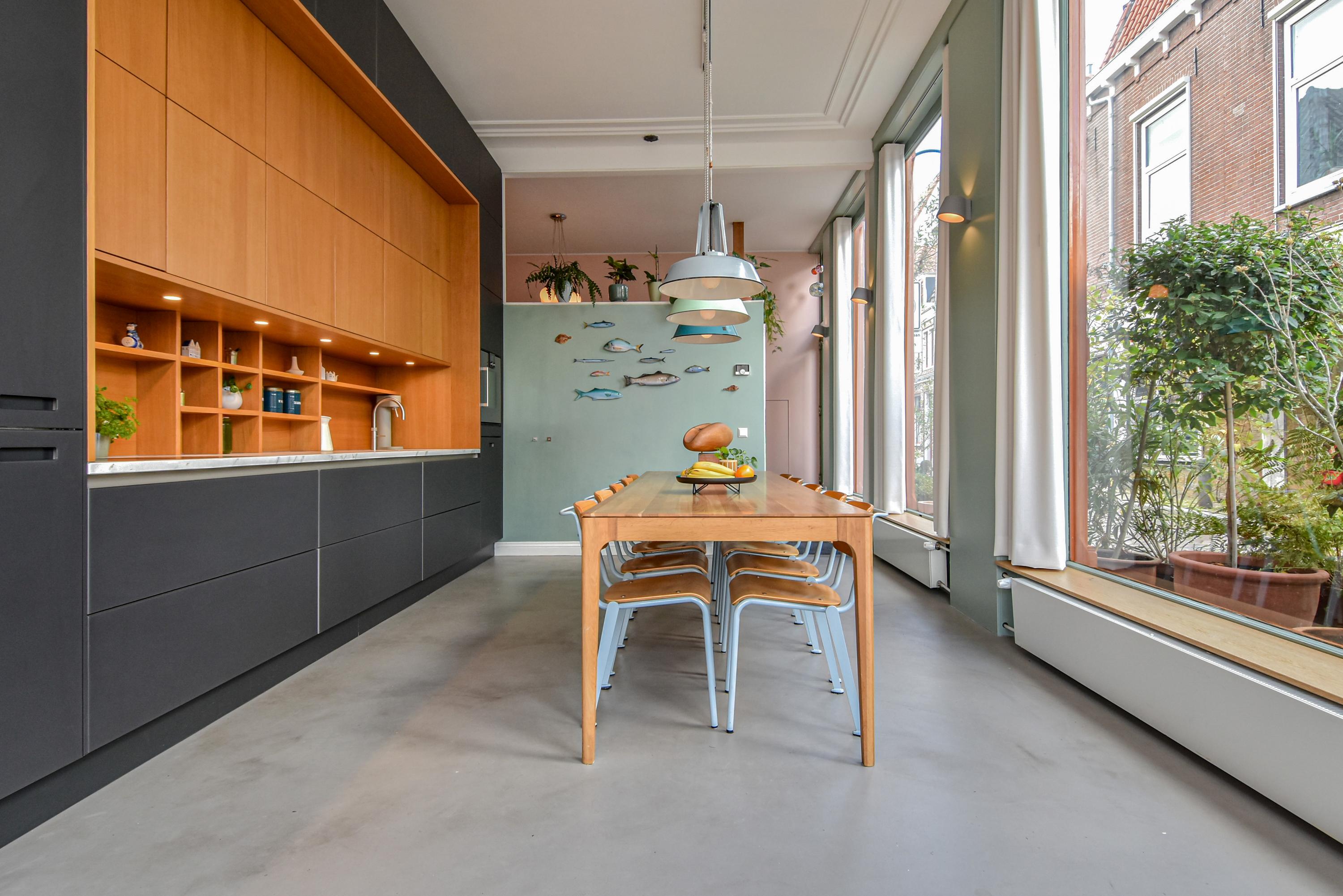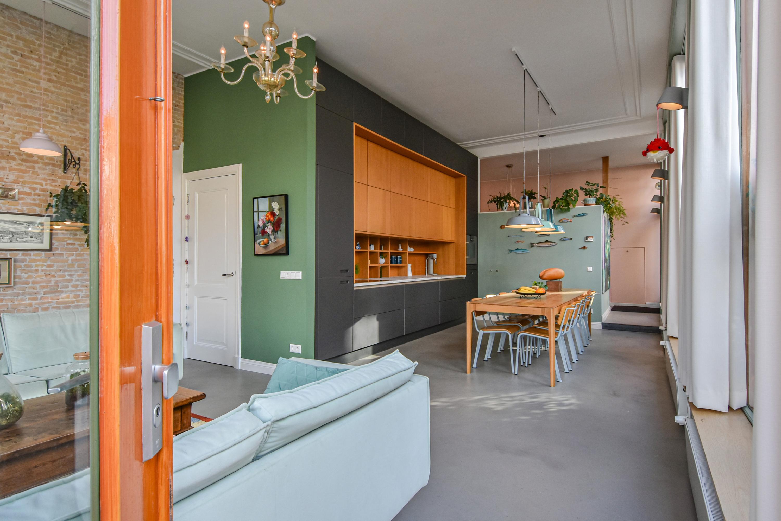 步入室内,挑高至3.55米的玻璃立面和天花板定义了主要的开放式厨房客厅。保存完好的灰泥雕饰和彩绘玻璃窗,彰显出建筑的历史传承。厨房配有高端嵌入式家电,并设有用餐与待客区,两侧环绕着宽敞的起居空间。一间带独立入口和地暖卫浴的综合工作室,可灵活作为客房或办公区。底层还设有充足储藏空间,并可直通Broerhuisstraat。