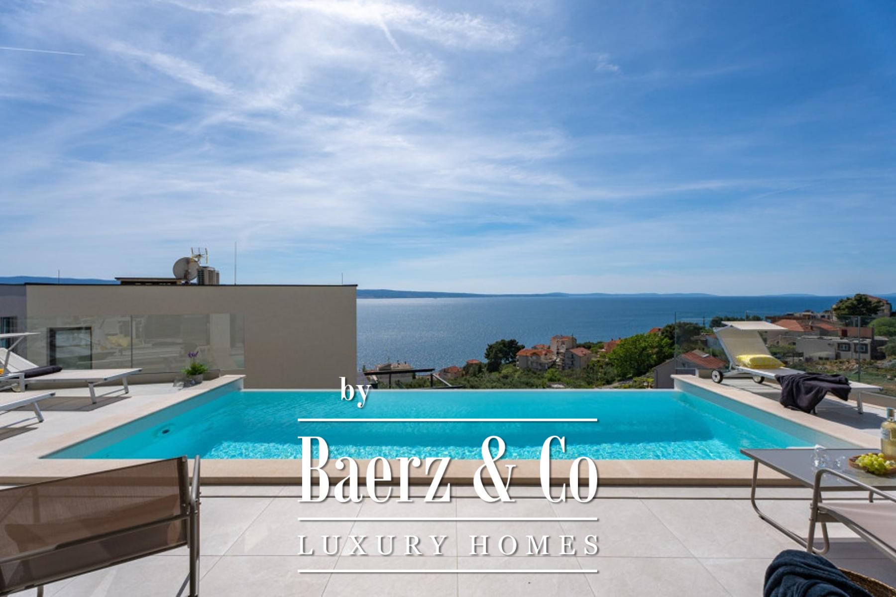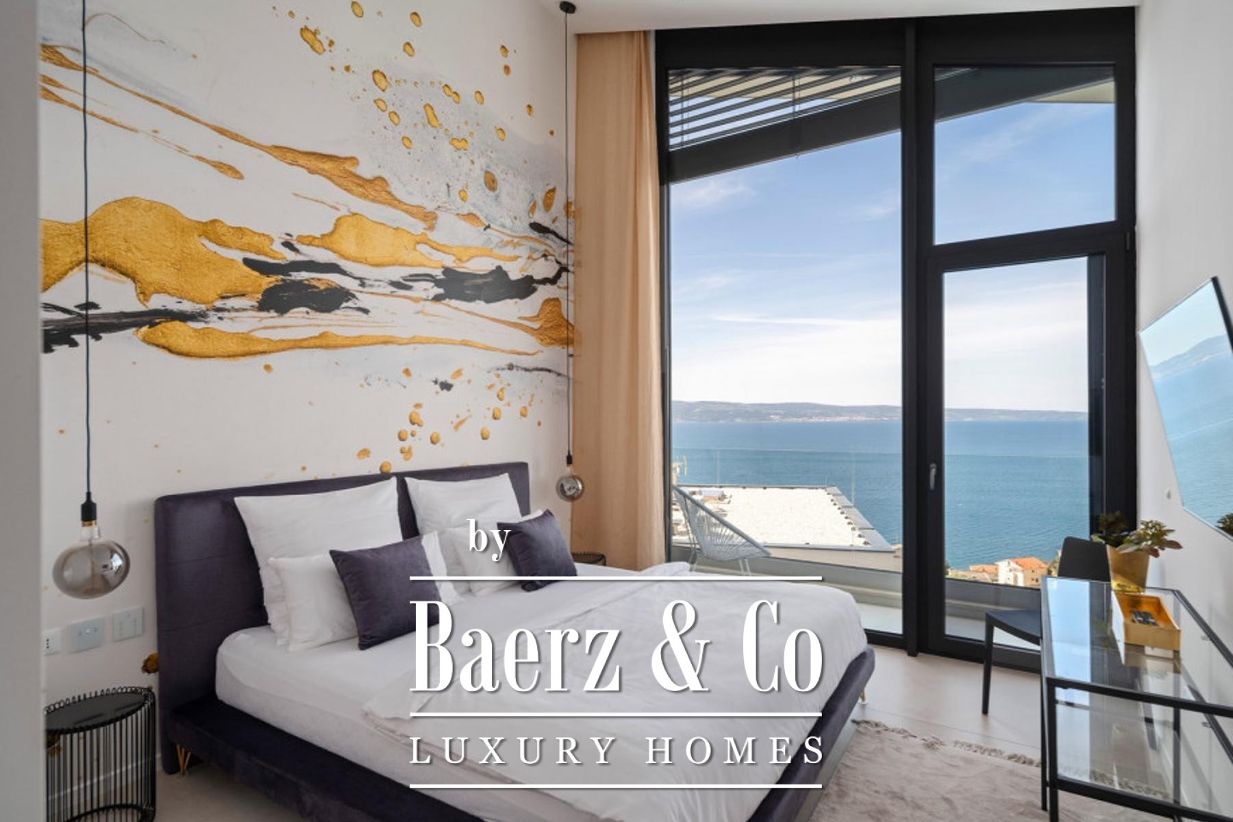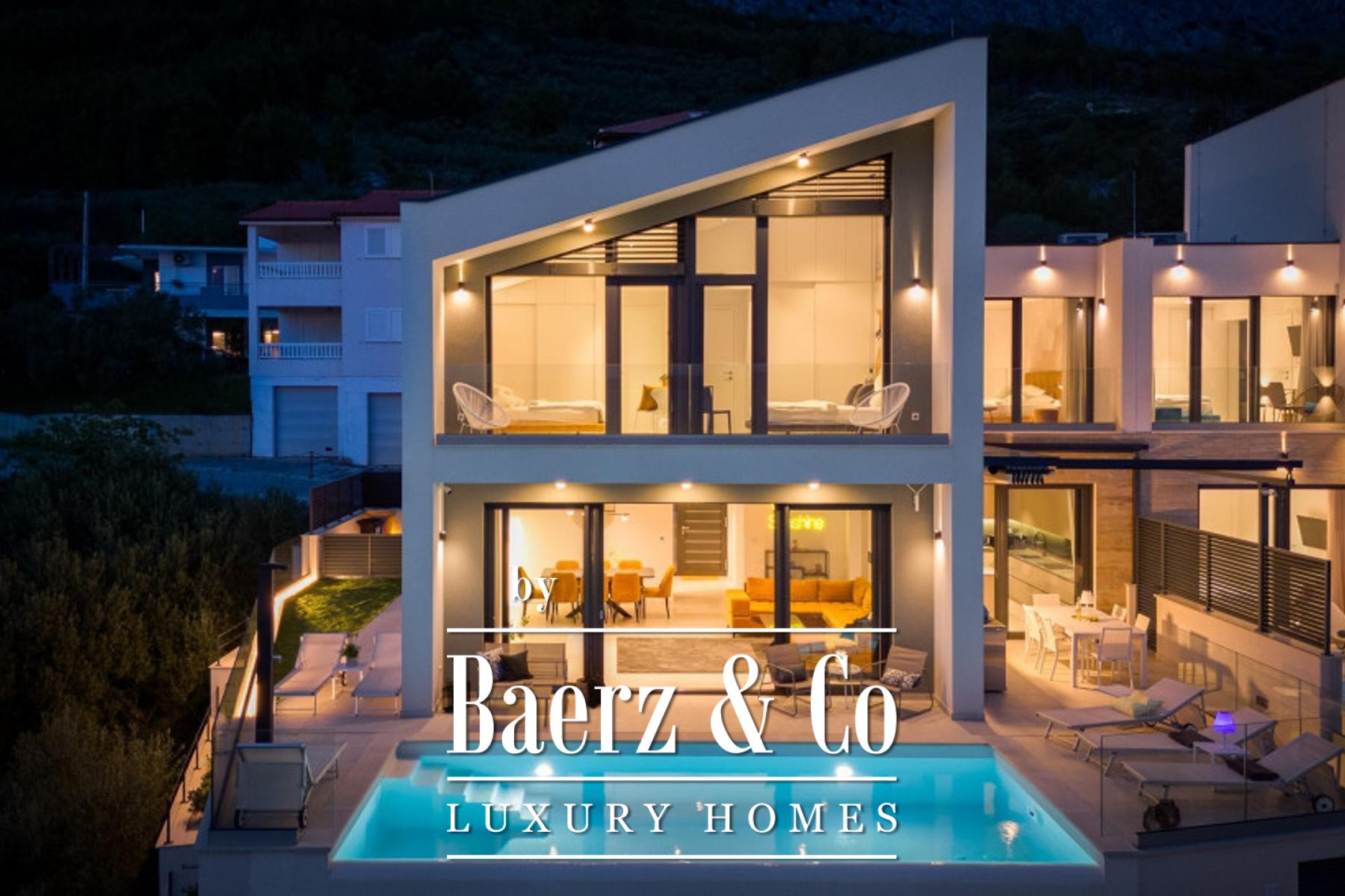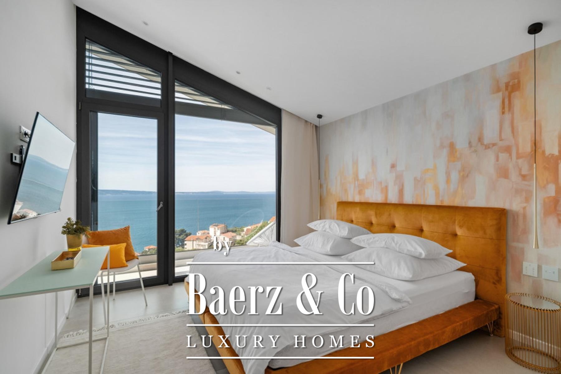Jesenice, a modern semi-detached villa with a beautiful sea view. It extends over three floors, with a net usable area of 222 m2. It consists of an open-concept living room, kitchen and dining room, 3 bedrooms, 2 bathrooms and one toilet, as well as a beautiful terrace with a swimming pool and a sunbathing area.The large kitchen with dining room and living room have direct access to the terrace through large sliding walls.It has 2 parking spaces.The villa was built to the highest technical standards, including smart home technology, underfloor heating, air conditioning and electrically operated roller shutters.Completed in 2023, it is fully furnished and equipped and is being sold as such.The advertised price refers to the purchase of the villa with the company that owns it.Other information on request