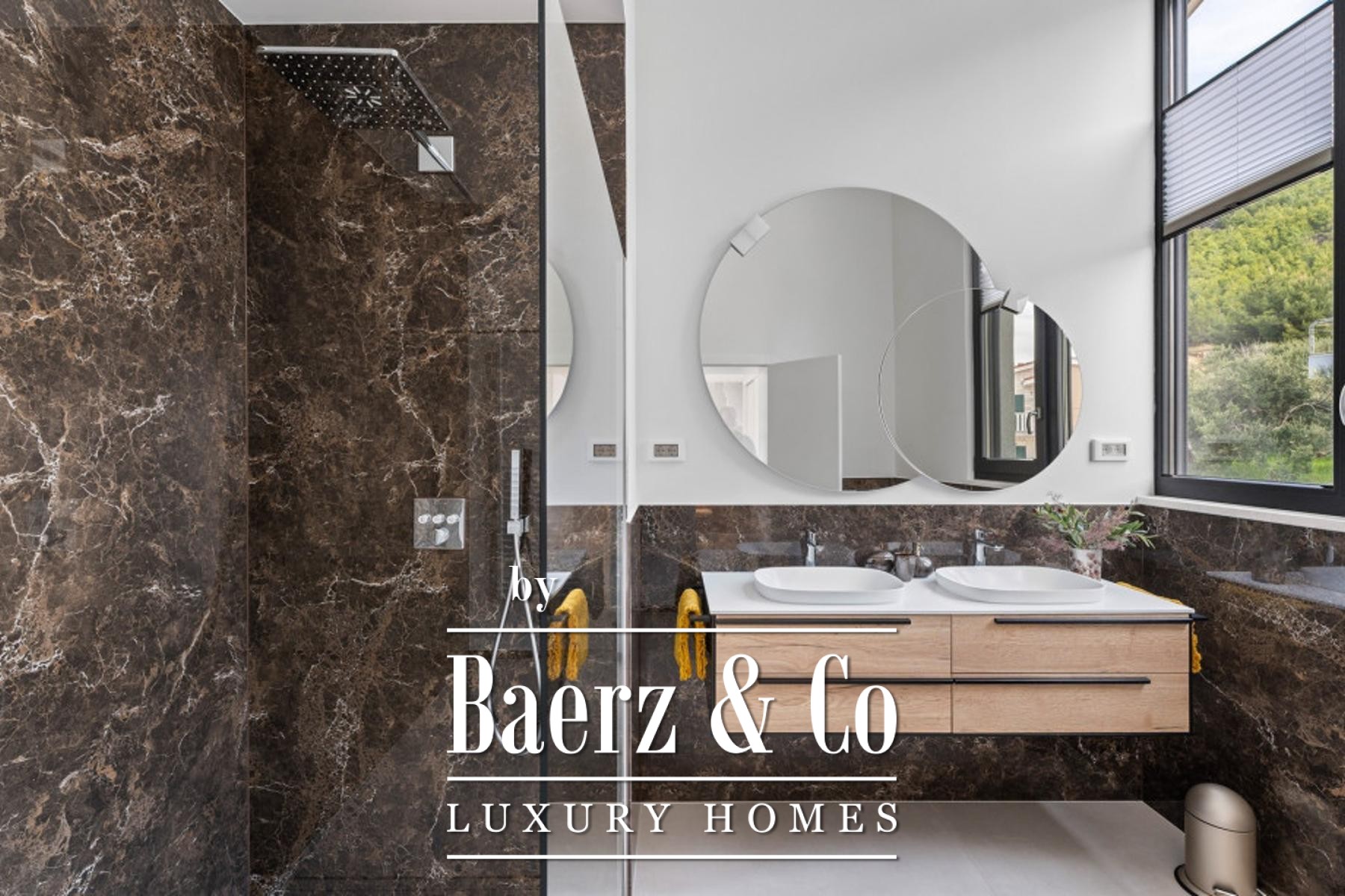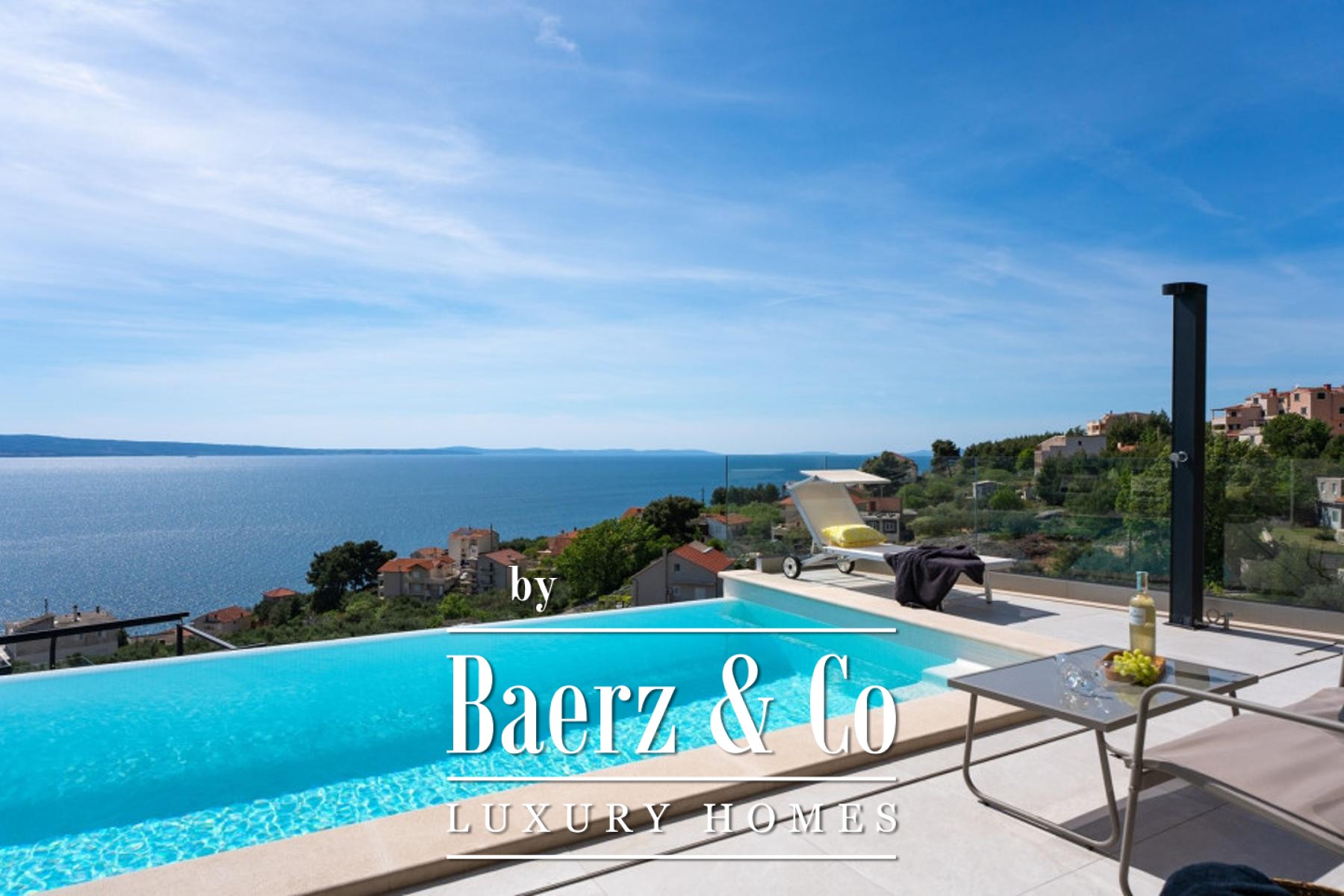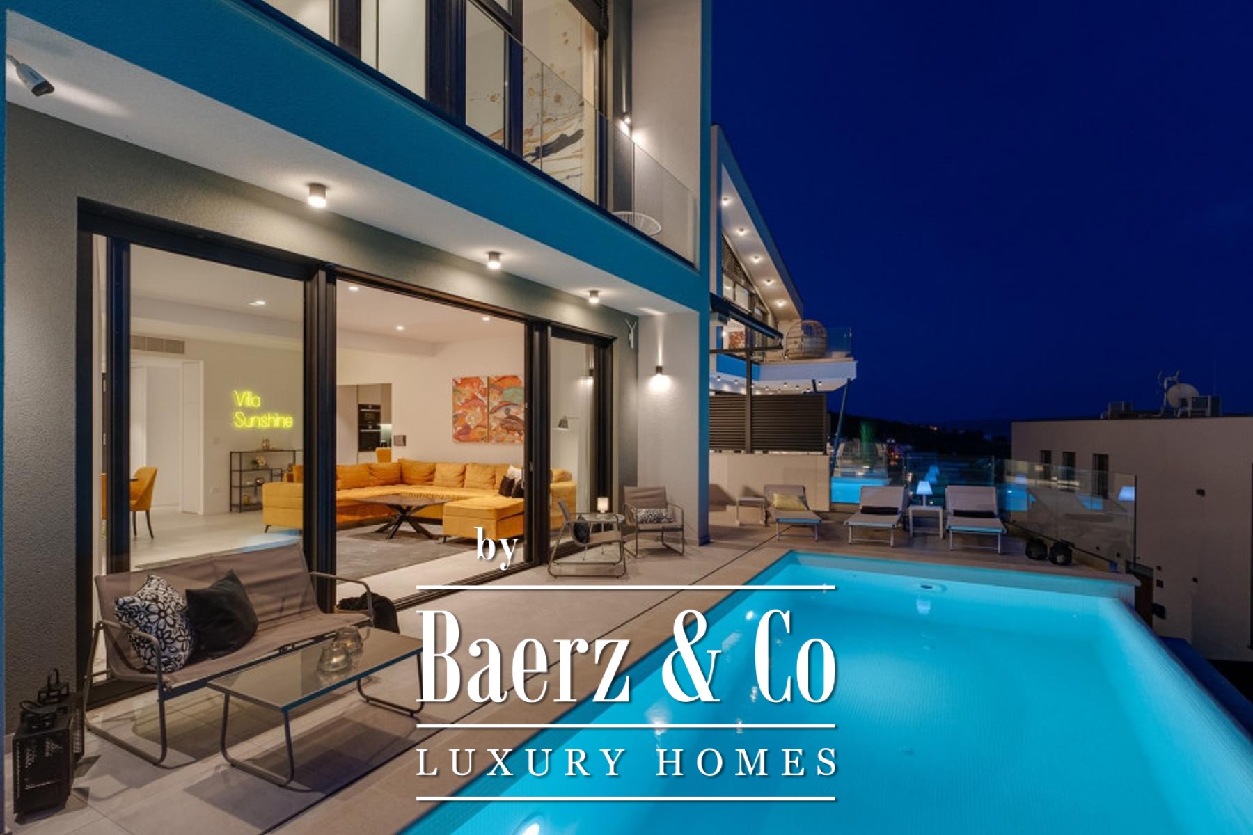 Jesenice, a modern semi-detached villa with a beautiful sea view. It extends over three floors, with a net usable area of 222 m2. It consists of an open-concept living room, kitchen and dining room, 3 bedrooms, 2 bathrooms and one toilet, as well as a beautiful terrace with a swimming pool and a sunbathing area.The large kitchen with dining room and living room have direct access to the terrace through large sliding walls.It has 2 parking spaces.The villa was built to the highest technical standards, including smart home technology, underfloor heating, air conditioning and electrically operated roller shutters.Completed in 2023, it is fully furnished and equipped and is being sold as such.The advertised price refers to the purchase of the villa with the company that owns it.Other information on request