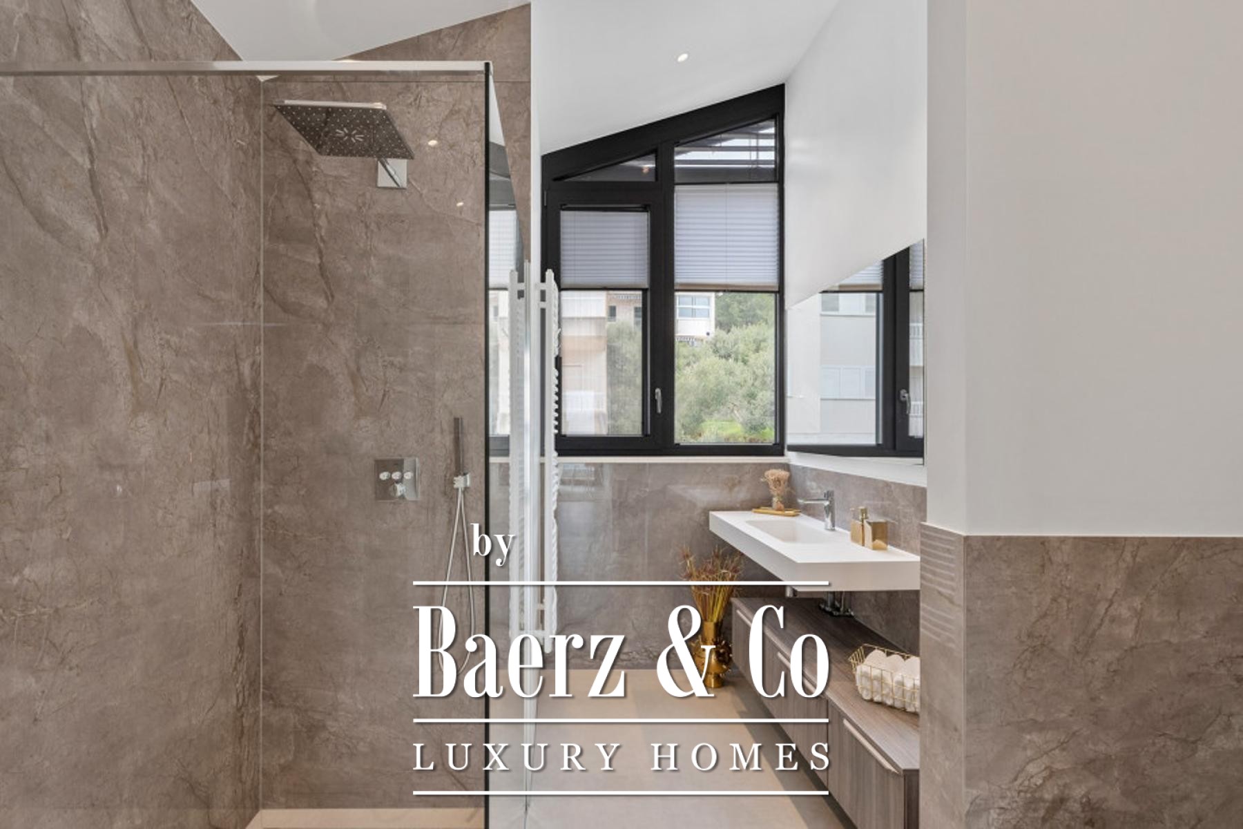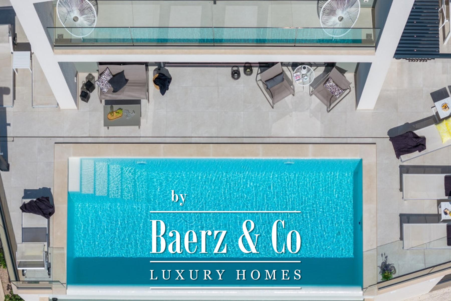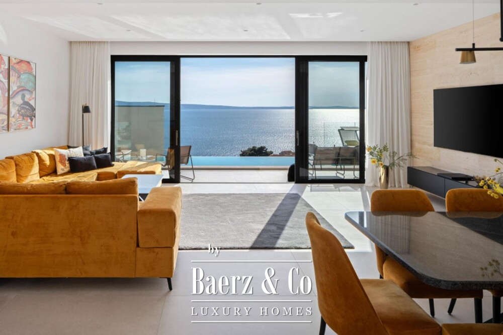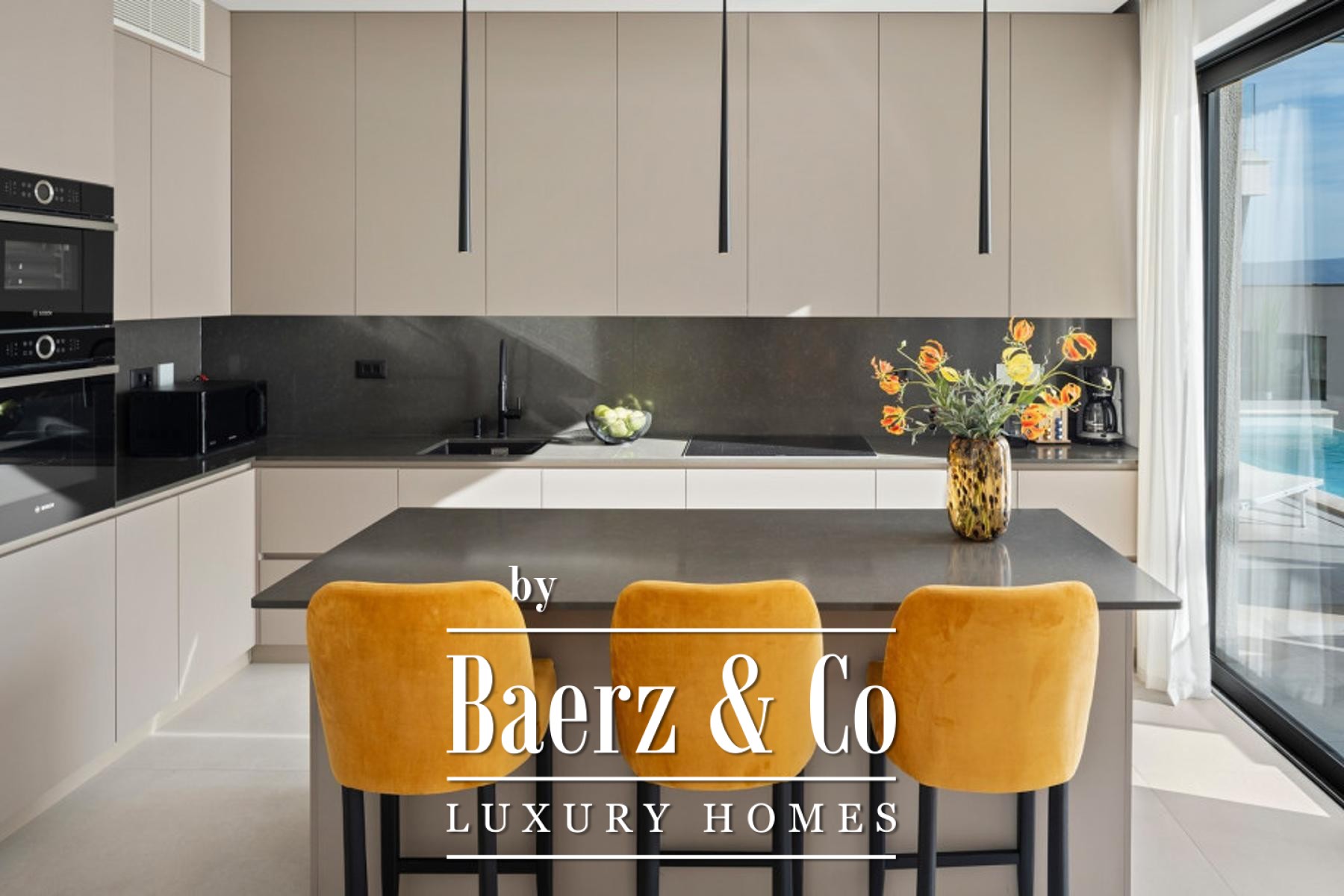 Jesenice, a modern semi-detached villa with a beautiful sea view. It extends over three floors, with a net usable area of 222 m2. It consists of an open-concept living room, kitchen and dining room, 3 bedrooms, 2 bathrooms and one toilet, as well as a beautiful terrace with a swimming pool and a sunbathing area.The large kitchen with dining room and living room have direct access to the terrace through large sliding walls.It has 2 parking spaces.The villa was built to the highest technical standards, including smart home technology, underfloor heating, air conditioning and electrically operated roller shutters.Completed in 2023, it is fully furnished and equipped and is being sold as such.The advertised price refers to the purchase of the villa with the company that owns it.Other information on request