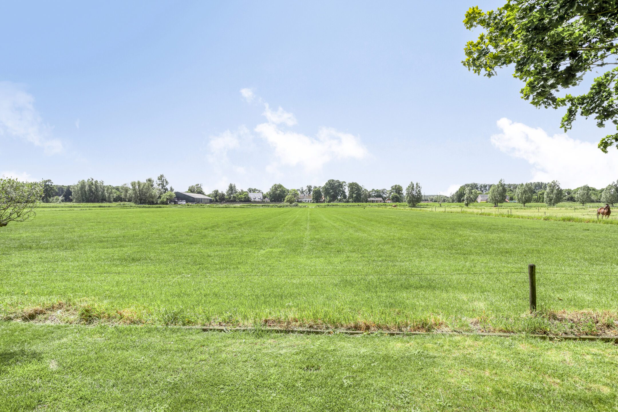Aangelegde tuin rondom, terras bestraat met natuursteen, voorzien van een veranda tussen woning en loods, borders, gazon, vijverpartij, vrij uitzicht over de landerijen, vrij pad langs de woning t.b.v. achterom, lange oprijlaan overlopend in voorterrein als aangelegd met gebakken klinkers vv. straatkolken, deels betonklinkers en een groen plein, grotendeels omheind vv. elektrische poort met beeldcamera.