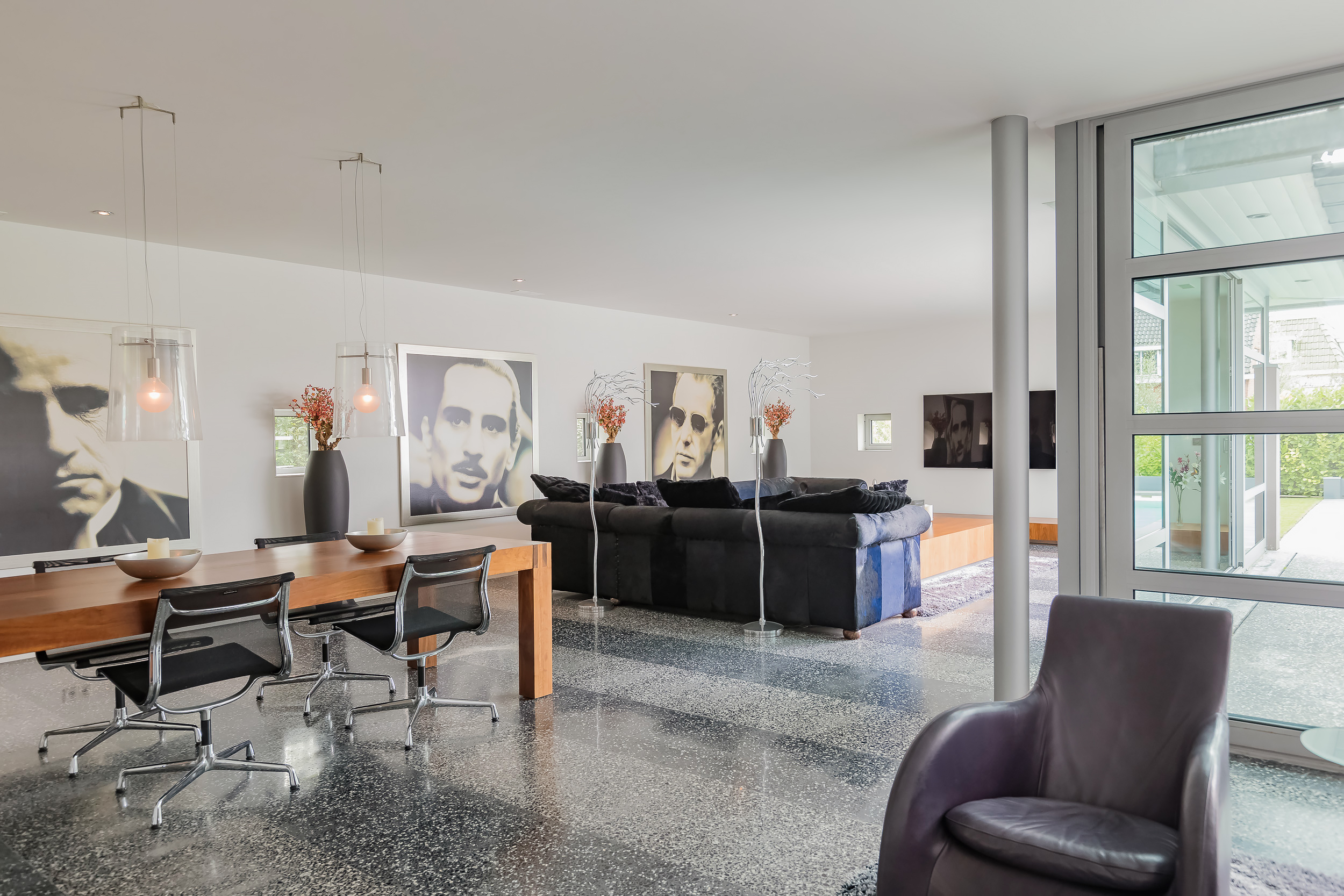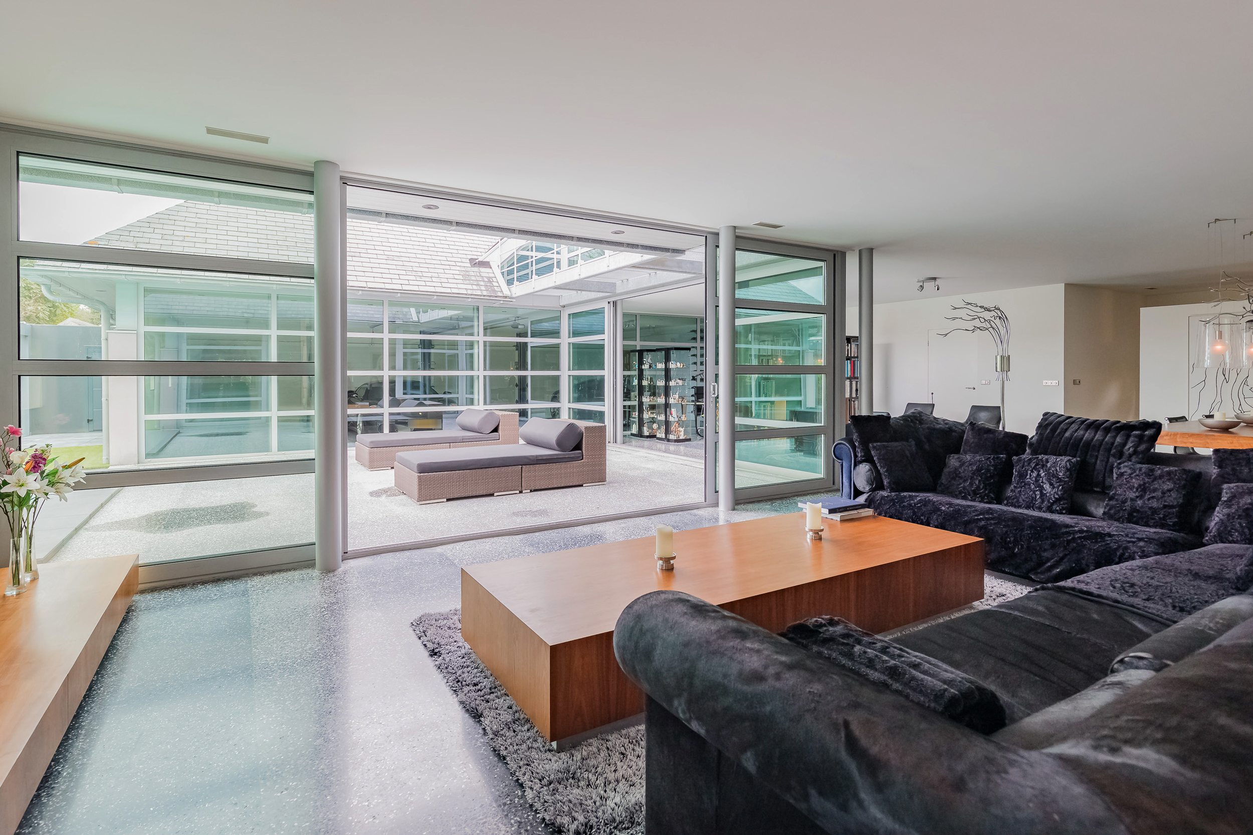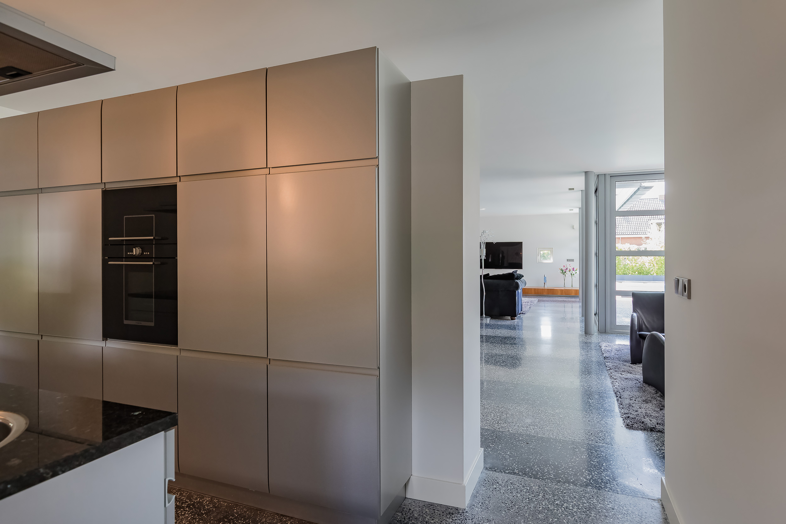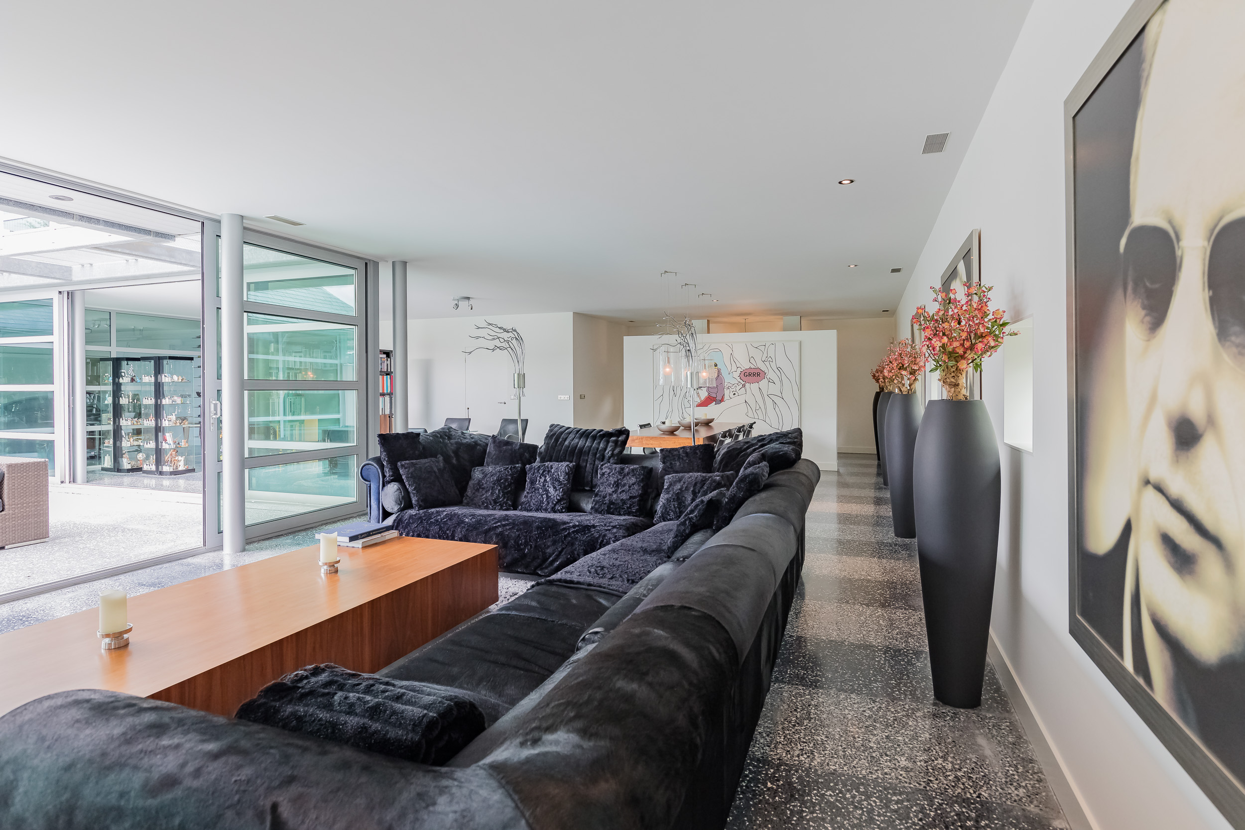 对称美学贯穿整个空间设计,从明亮入口大厅中引人注目的玻璃楼梯,到18米长大客厅及适合盛大宴请的餐区。厨房以流畅线条与高端电器为特色,静谧地划分主起居空间。室内的水磨石地面配备地暖,与露台无缝衔接,将内饰延伸至西南朝向的花园,巧妙映衬温水游泳池和水域边界。