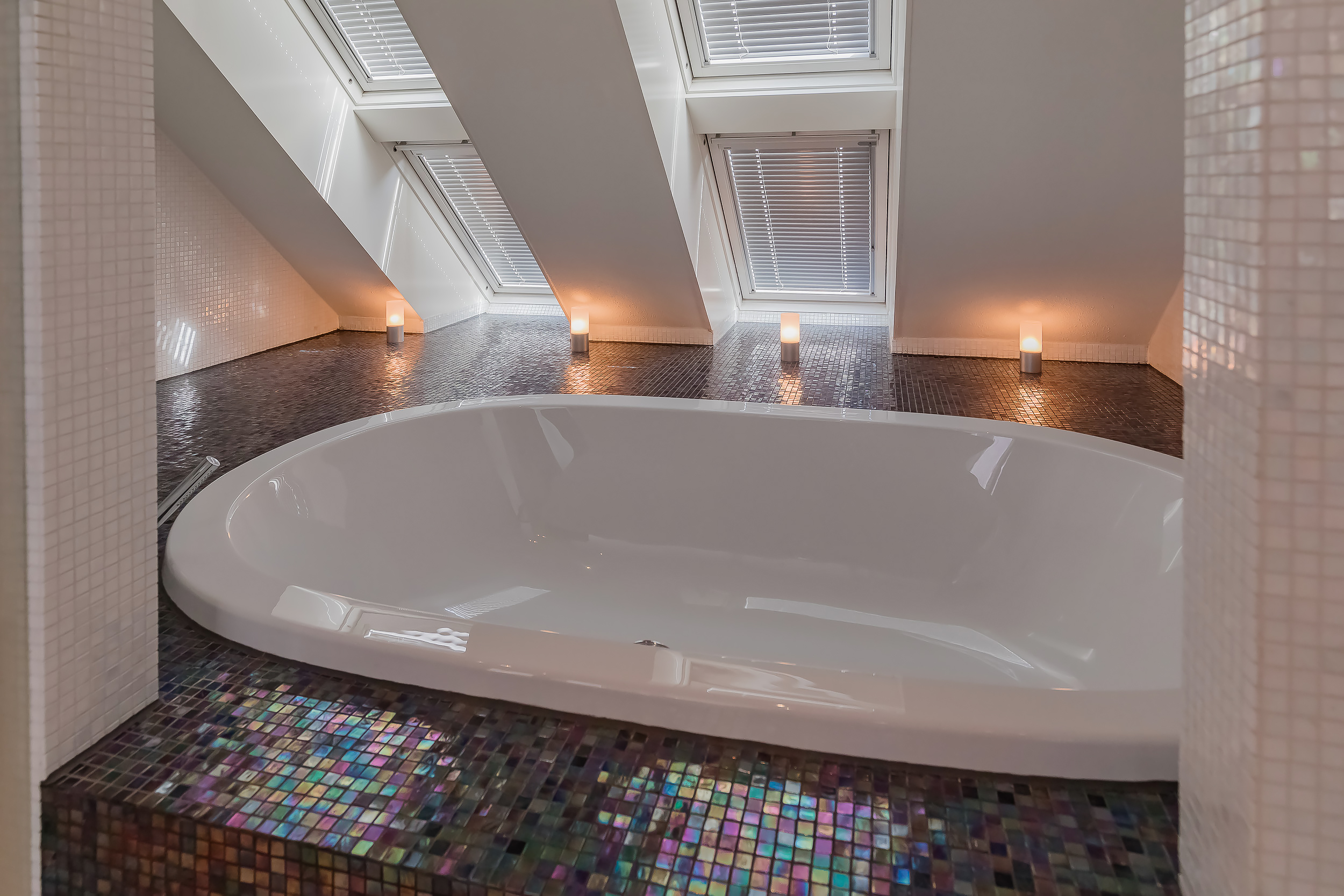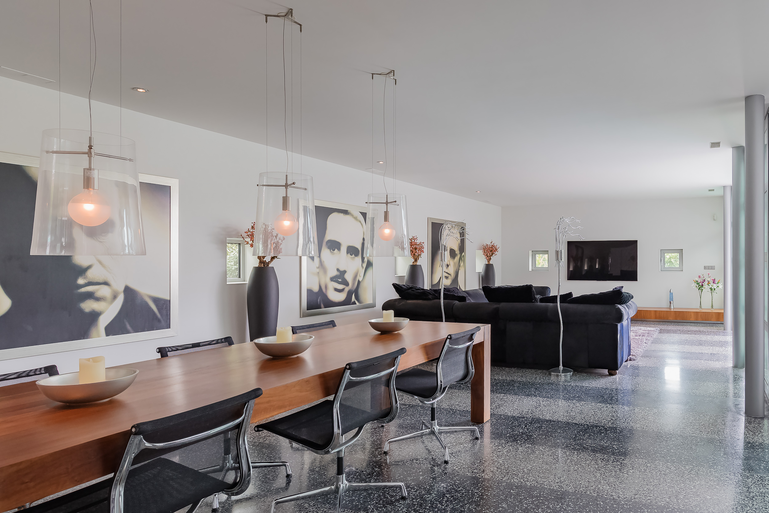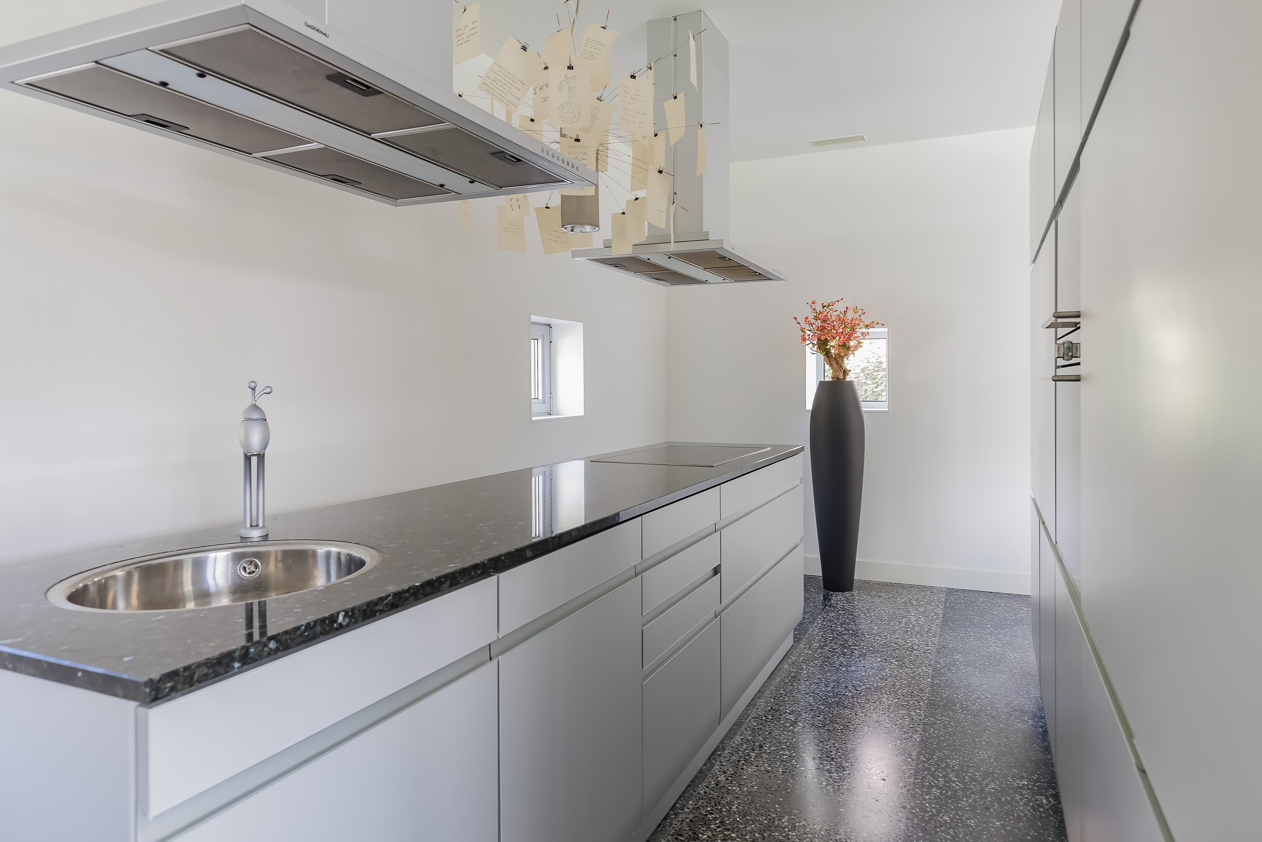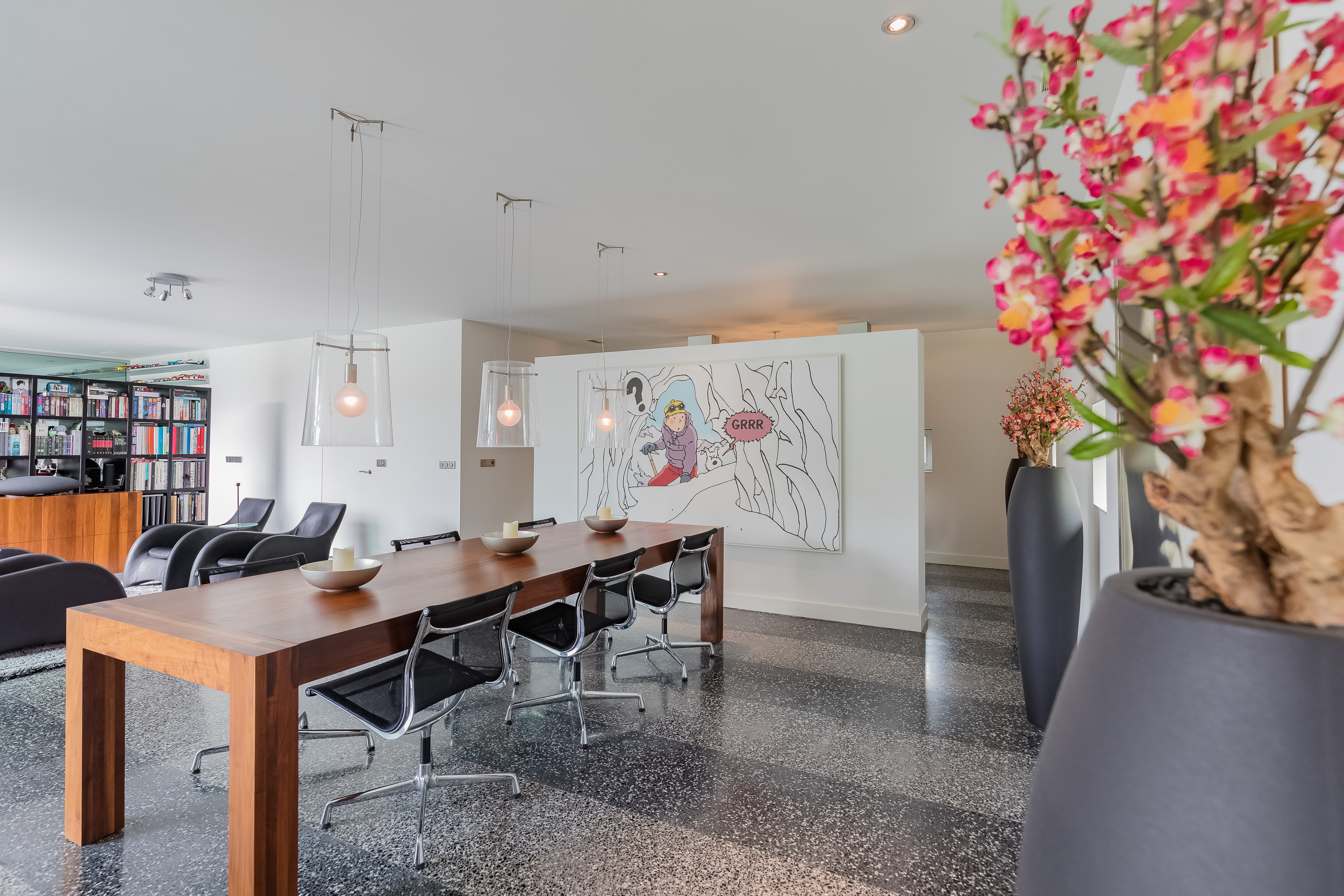 对称美学贯穿整个空间设计,从明亮入口大厅中引人注目的玻璃楼梯,到18米长大客厅及适合盛大宴请的餐区。厨房以流畅线条与高端电器为特色,静谧地划分主起居空间。室内的水磨石地面配备地暖,与露台无缝衔接,将内饰延伸至西南朝向的花园,巧妙映衬温水游泳池和水域边界。