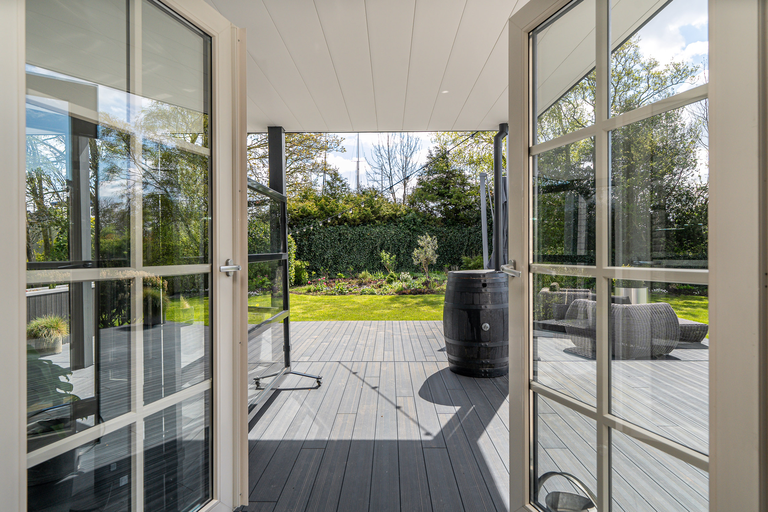 新建且全屋隔热的客房可灵活用作工作室或家庭办公,内含小厨房、浴室和朝西南向的宽大窗户,尽览自然美景。双车库包括工作间、实用储藏及可用作灵活收纳或创意空间的楼上空间,约可停车九辆车。
