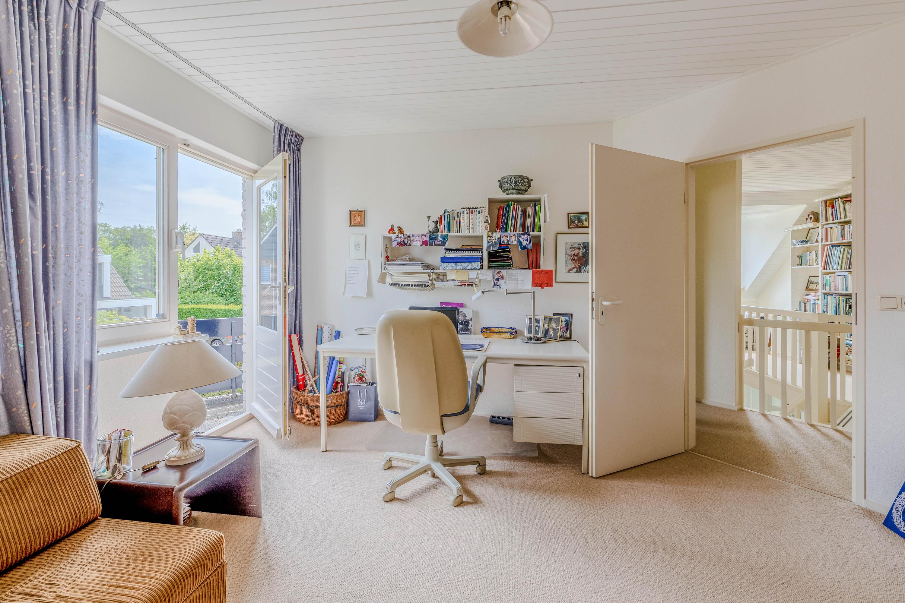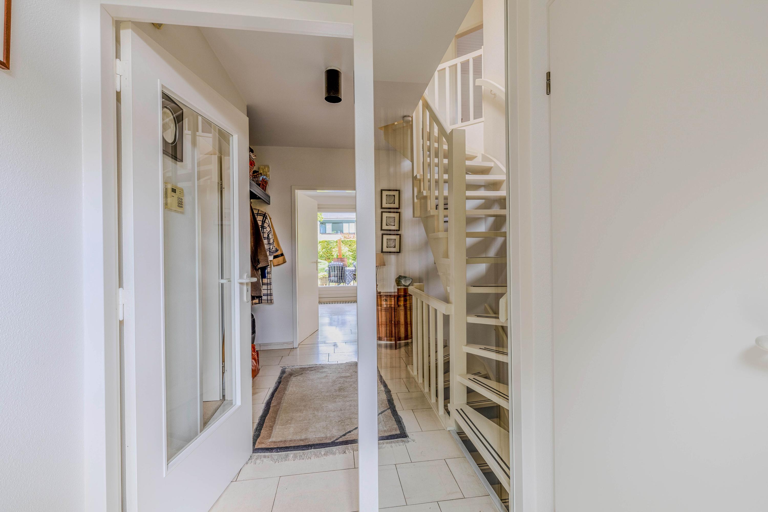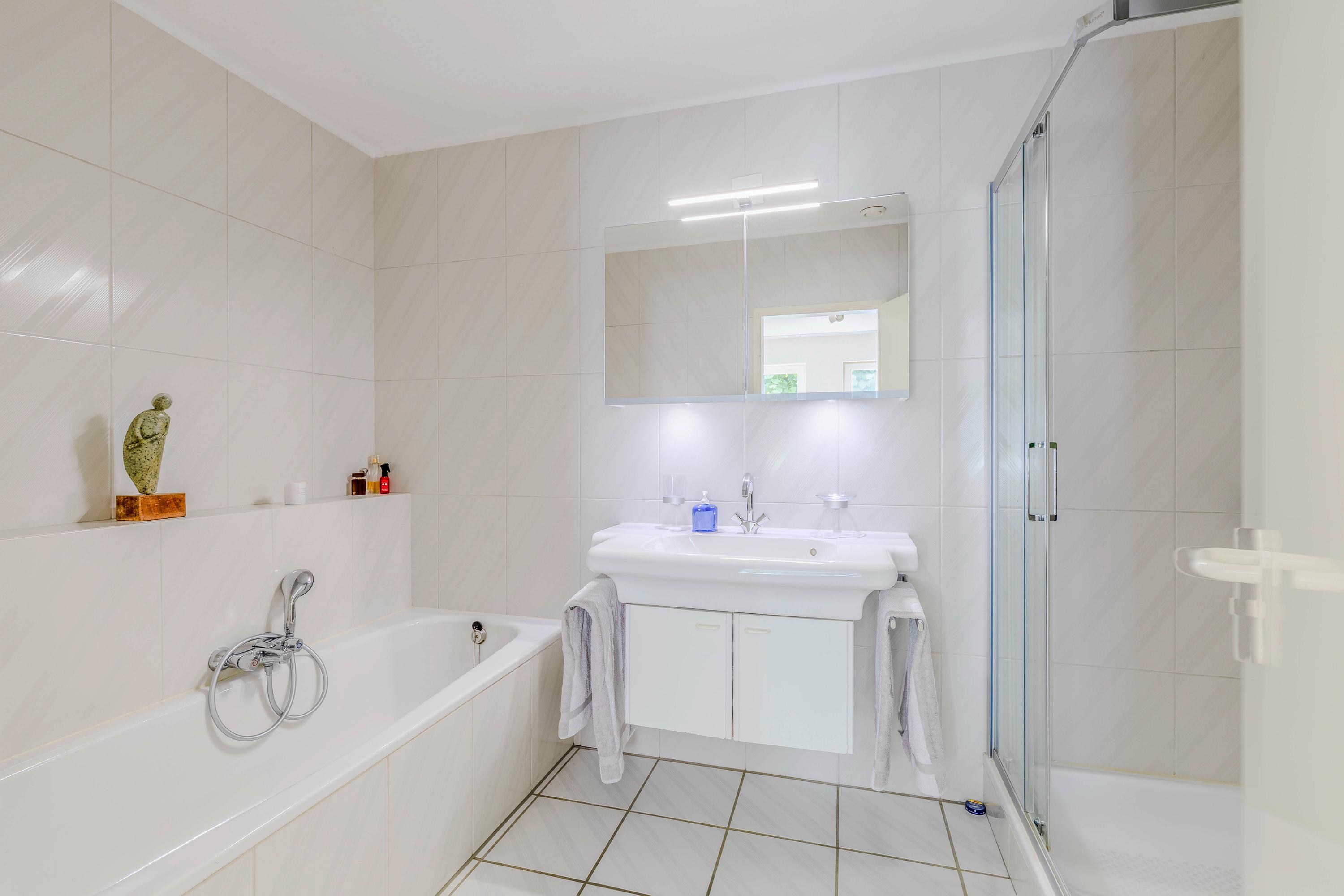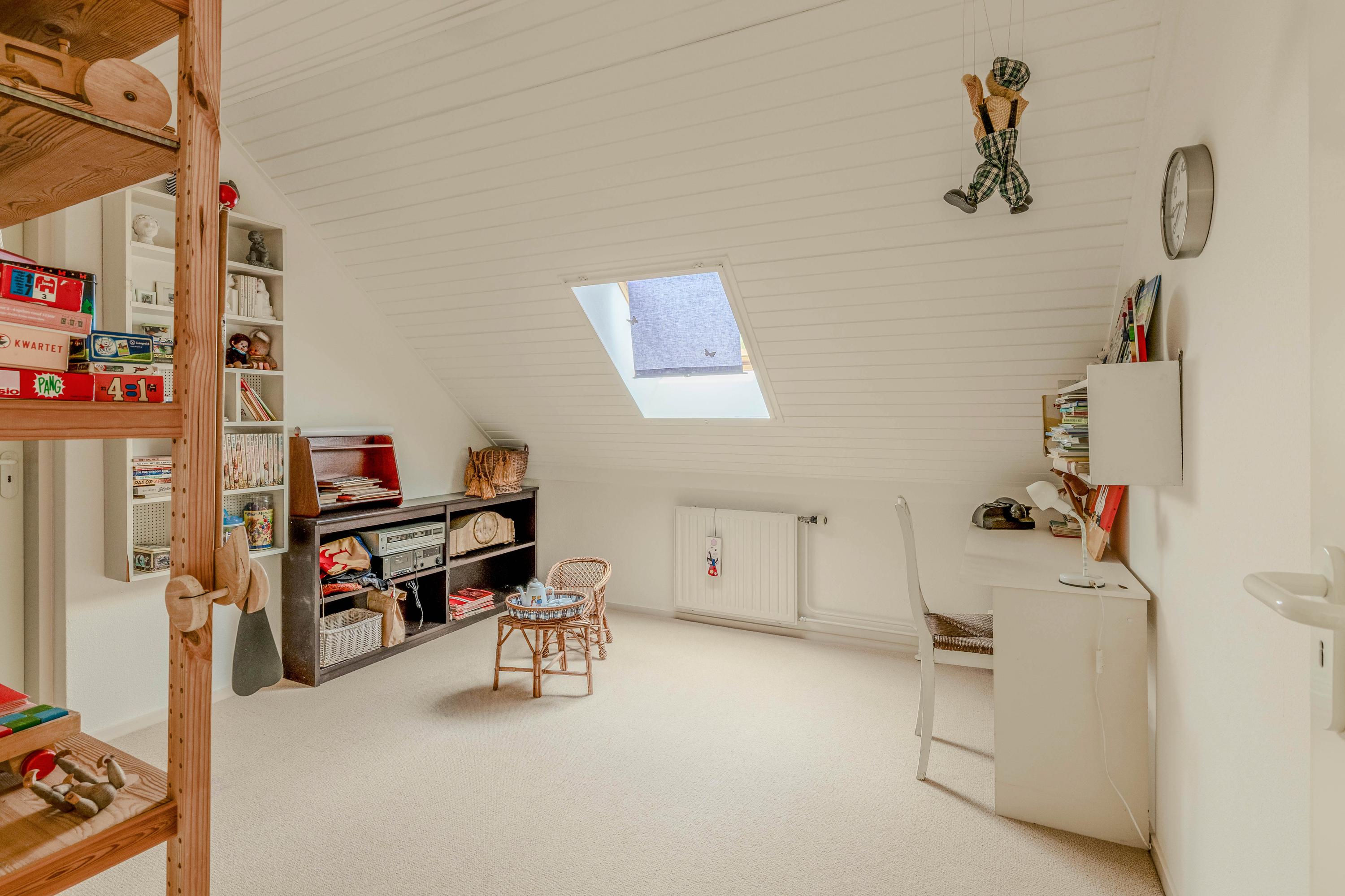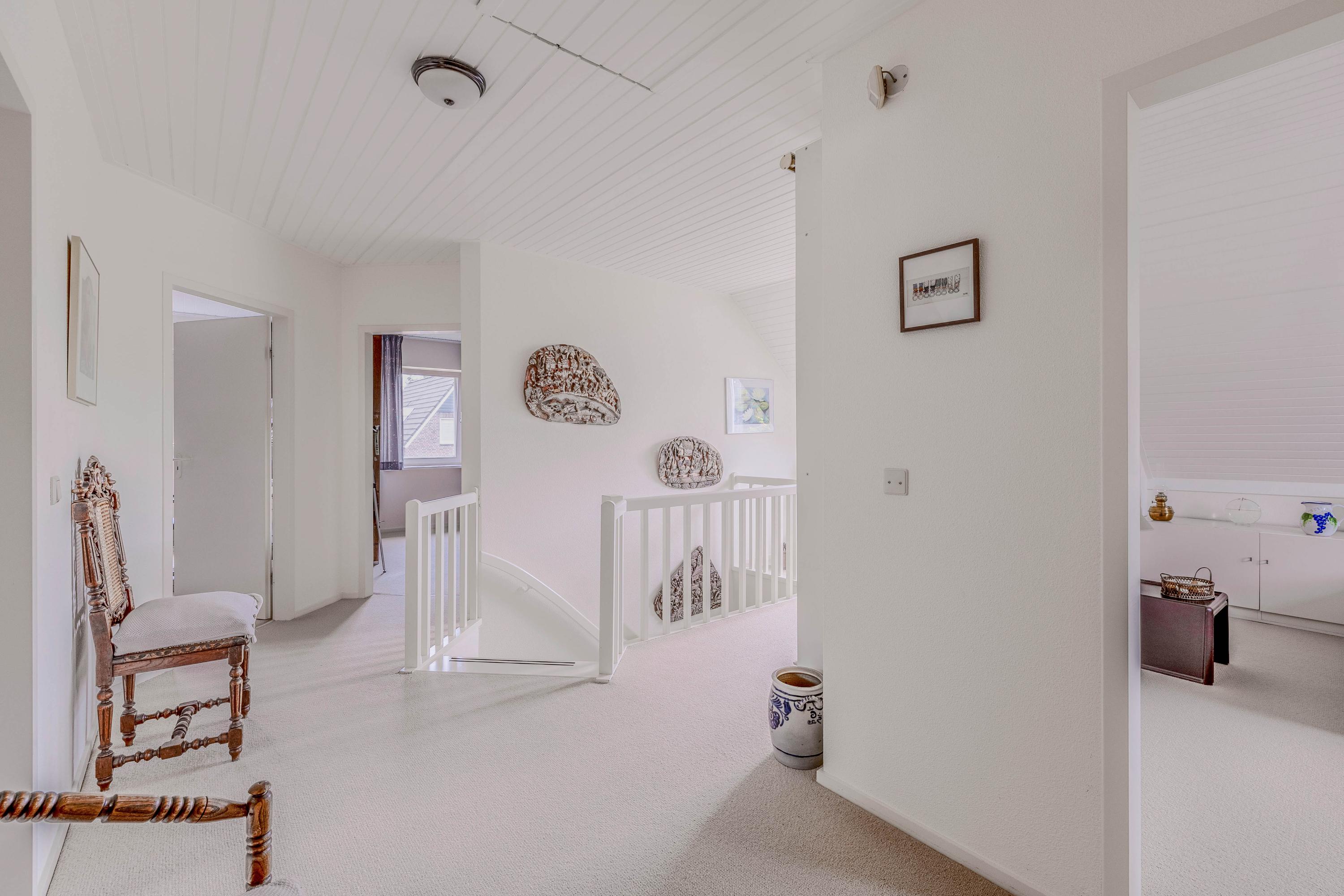 二层布局包括五间卧室与第二间浴室,其中一间卧室可通往未来的康养空间,另一间连接阳台。地下室、阁楼及21 m²带加热功能的分段门车库(花园直通)提供灵活储物与多样功能。户外,成熟林木与精致绿篱环绕多处休憩区,营造静谧绿洲,适合安宁家庭生活或户外聚会。
